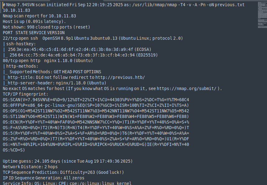 nmap -T4 -v -A -Pn 10.10.11.83 -oN previous.txt