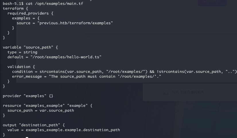 因为目录限制了/opt/examples 下寻找配置文件,这是/opt/examples/main.tf,而且没有权限修改