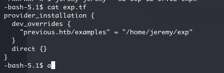 export TF_CLI_CONFIG_FILE=/home/jeremy/exp/exp.tf